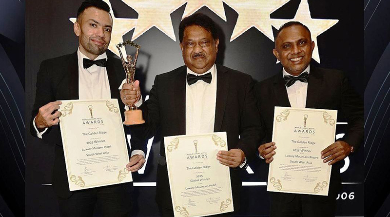The Golden Ridge, the first-ever star-class mountain resort in Nuwara Eliya, has achieved international acclaim by being crowned a Global Winner at the World Luxury Awards 2025, held on October 31, 2025, at the PARKROYAL Hotel Pickering, Singapore. The resort proudly secured three prestigious accolades: Global Winner – Luxury Mountain Hotel, South West Asia Winner – Luxury Modern Hotel, South West Asia Winner – Luxury Mountain Resort Nestled 7,339 feet above sea level in Sri Lanka’s highest town, The Golden Ridge seamlessly blends breathtaking mountain vistas with refined hospitality and exceptional service standards. Spanning five acres, the resort features 82 luxurious rooms and suites, including Deluxe, Deluxe Quadruple Family Rooms, Junior Suites, and Mountain View Suites, each thoughtfully designed to deliver unmatched comfort and memorable experiences.